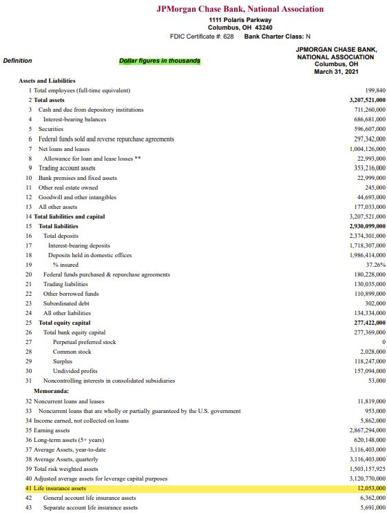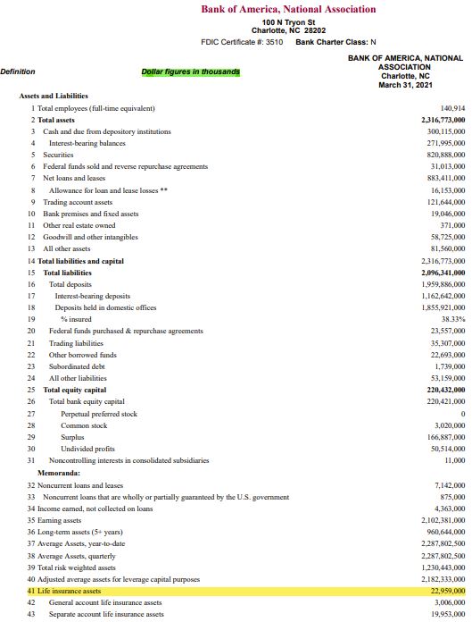 Bank of America, Chase, and many other banks invest billions of dollars into life insurance to maintain and grow their businesses. See their asset and liability holdings below: