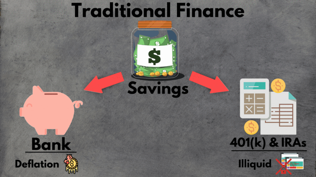 In traditional finance, people take their savings, store them in banks where there is little to no growth and invest in retirement accounts that give non-guaranteed returns. Retirement accounts are illiquid, penalize people for taking money out early, and restrict what investors can do with their cash!