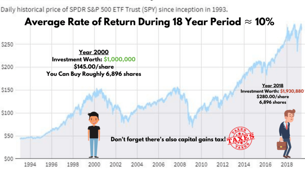 Because of the “catch-up” periods during dips and especially during recessions in the market, you actually earned $3,629,037 LESS than what was projected using the average return! To re-cap, the fluctuation in account value, capital gains tax, and inheritance tax (when transferring wealth to the next generation) are reasons why the wealthy stay away from holding their cash in stocks.