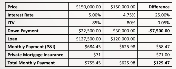 Here is an example of the benefits of putting a full 20% down versus 15%.