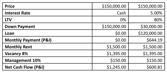 If you pay $150,000 in cash for one property, your net cash flow is $1245.00. By putting 20% down with an 80% loan-to-value and a 5% mortgage rate, your net cash flow is reduced to $600.81. Let’s not stop there. Keep in mind that a 20% down payment on a $150,000 home is only $30,000. If you bought FIVE $150,000 homes and put 20% down on each with the same conventional loan terms and monthly rents, you could increase cash flow from $1245.00 a month to $3004.05 a month. Invest your money wisely.Â